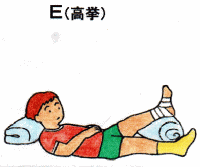 E 高挙 なるべく心臓より、怪我した部位を高く挙げます。