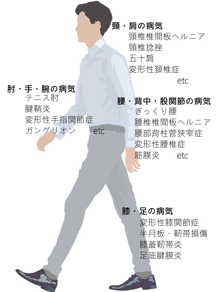 では、整形外科に行く場合は、どんな病気を治療するのでしょうか?整形外科が扱う病気の範囲をイラストで部位と病気を表してみました。